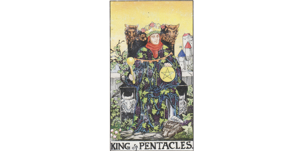 Here we see a king seated on a throne adorned with bulls' heads. This king is dressed in luxurious robes featuring vine and grape embroidery, while they hold a golden scepter and pentacle. Surrounded by luxury and abundance, this one wears an expression of peace and relaxation. Even though they’re in charge of a whole kingdom, they’re not the least bit worried.