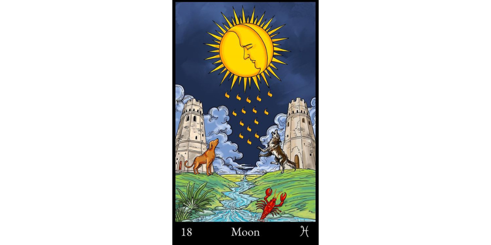 The Moon card invites us into the deep, shadowy realms of the subconscious. It whispers of mystery and intuition, leading us on a path lit only by its reflected glow. Traditional depictions of this card teem with symbolism: the crustacean emerging from water, the dogs guarding the path, the watchtowers standing sentinel over the unknown.